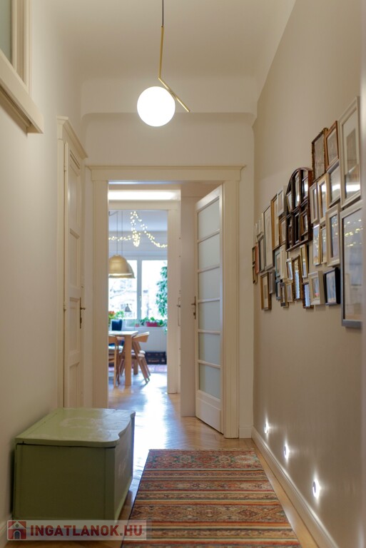 A lakás felújítása során kicserélték a vezetékeket, az új fa ablakok redőnnyel, szúnyoghálóval felszereltek, az eredeti parketta a lakás teljes terjedelmében futóban rakva.