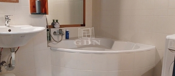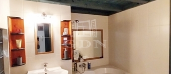 Jobb oldalon találjuk a 3,5 nm-es igazán hangulatos, elegáns ,sarokkádas , egyedi fagerendás megoldású fürdőszobát. Mellette az ablakos külön nyíló mosdót.