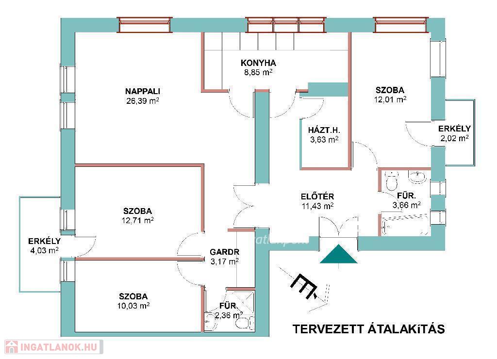 Az engedélyezett nyílásokat, és a lehetséges négy szoba kialakítását a mellékelt tervezett alaprajzon pirossal jelöltük.