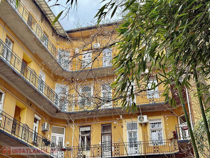 A nappaliból nyílik az 5 m²-es erkély, ahonnan a belső udvar zöld, fákkal sűrűn benőtt, szinte erdőszerű látványa tárul elénk, amely a városi környezetben ritka nyugalmat biztosít. A látvány inkább parkos, természetközeli érzetet kelt, mintsem klasszikus belső udvarét.