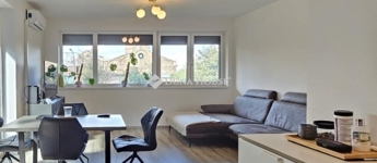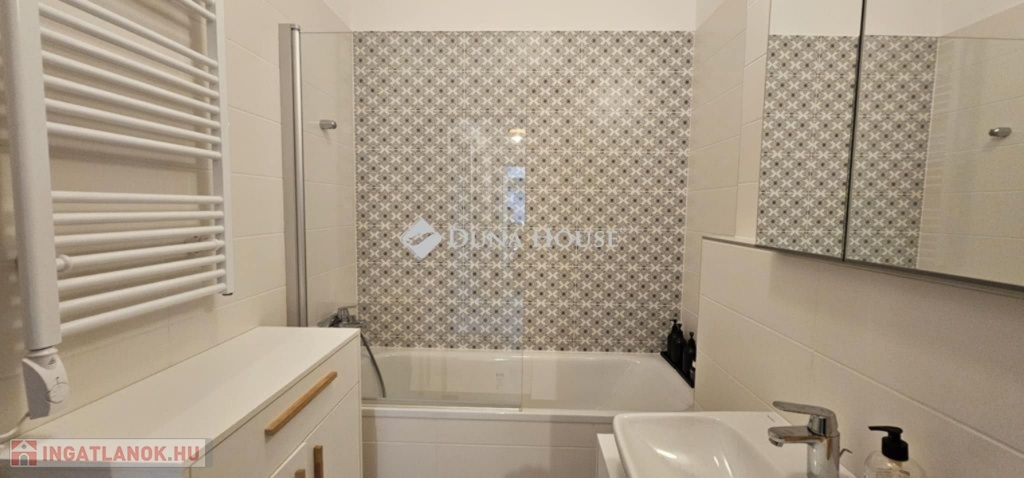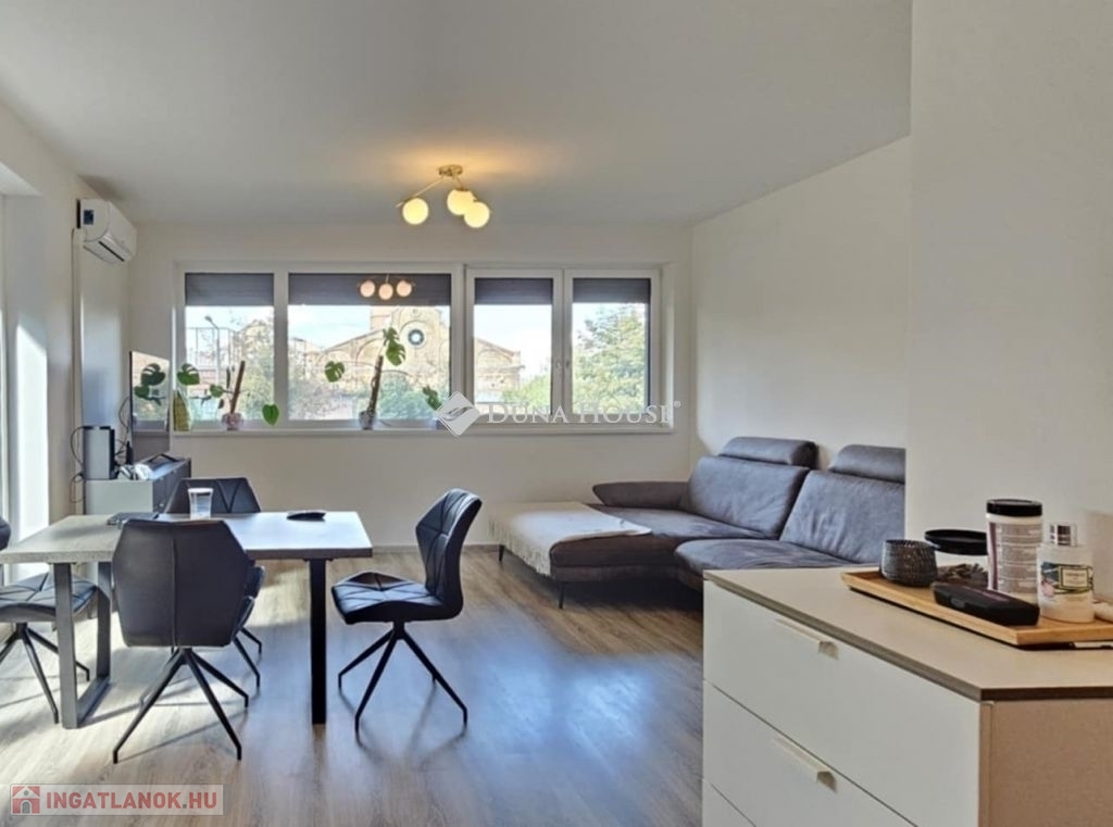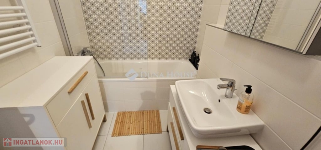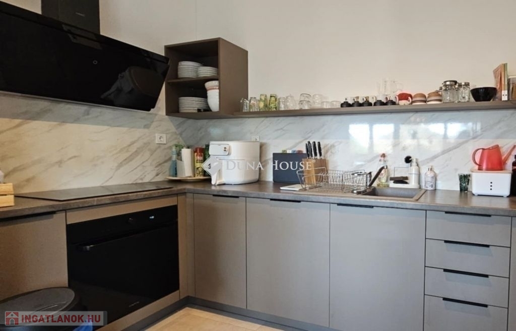 A lakás elrendezése: tágas, amerikai konyhás nappali étkezővel (34 nm), 2 hálószoba (13 nm + 12 nm), modern fürdőszoba káddal és WC-vel, külön WC. A konyha teljesen gépesített (beépített mosogatógép, hűtő, sütő), a lakás részben bútorozva eladó (étkezőasztal, székek, kanapé, szekrény). Minden szobában redőny található (távirányítós), a mennyezeti hűtés-fűtést pedig egy klíma egészíti ki.