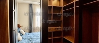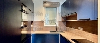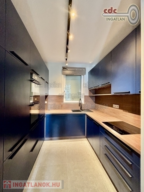 Az előszobából nyílik egy kisebb dolgozó, vagy vendégszoba, majd az egyedi, sötétkék színű, teljesen gépesített konyhába jutunk, amely a nappalival egy légtérben található.