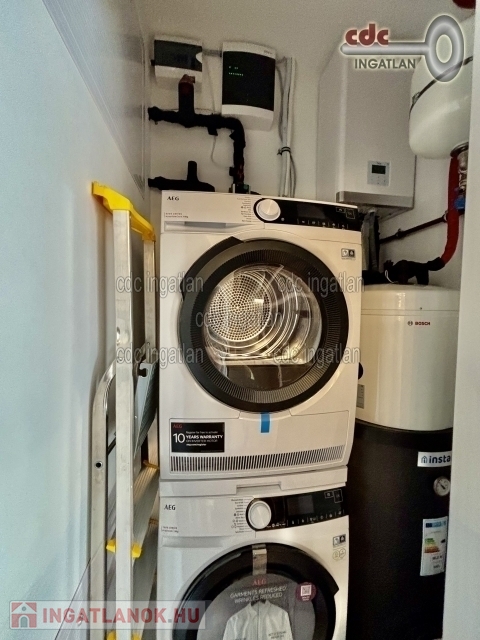 Az előszoba része egy háztartási/gépészeti helyiség, valamint egy különálló WC is. A nappaliból igényes tolóajtón keresztül érhető el a nagy méretű hálószoba, amelyhez saját gardrób és kádas fürdőszoba tartozik. Helyiségenként szabályozható, 4 zónás padlófűtés és mennyezethűtés, 8 kW-os Midea levegő-víz hőszivattyúval. Prémium minőségű burkolatok (olasz csempe stb.). Hőszivattyús használati melegvíz-ellátás 160 literes indirekt tárolóval. Teljesen gépesített konyha AEG készülékekkel és gránit mosogatótálcával. Okostelefonról vezérelhető, mindenhol elérhető LED világítás.