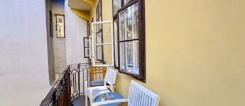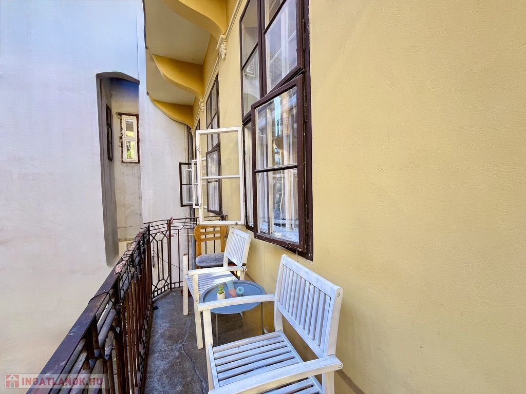 A lakáshoz kapcsolódik egy függőfolyosó végi kiülési lehetőség, amely nemcsak praktikus, hanem egyfajta belső udvari „városi terasz” élményt is ad – ritka adottság a belvárosban.