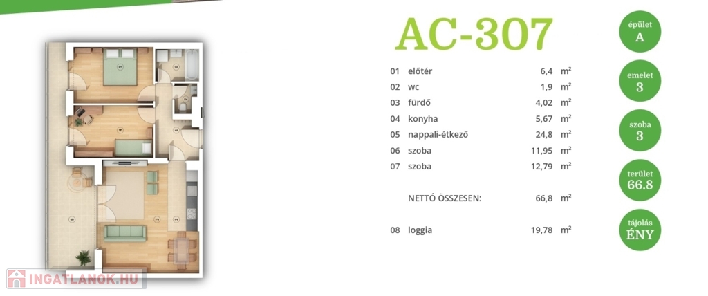 Ez a lakás nappali+2 hálós, 67nm alapterületű és tartozik hozzá egy 20nm-es terasz is.