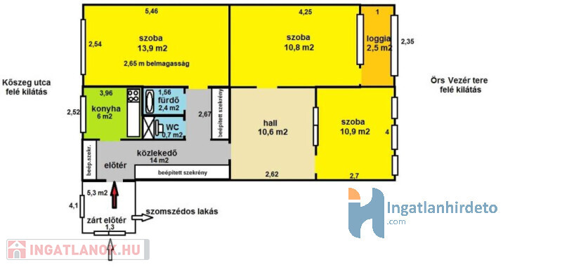 A konyha és az egyik nagyszoba a Kőszeg utca felé néz SZÉP kilátással, a másik két szoba déli irányba az Örs Vezér tere felé.