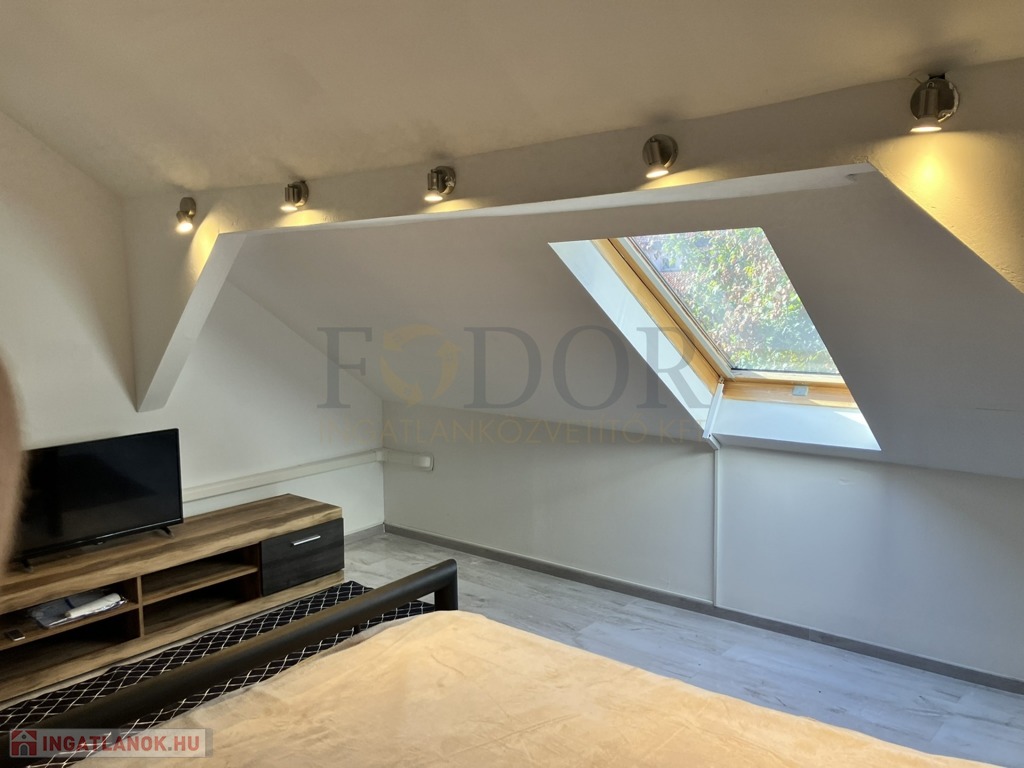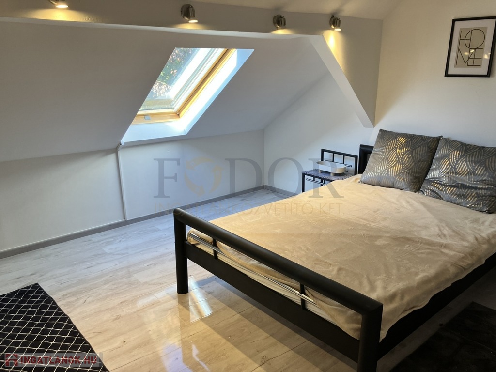 A teraszról lépcső vezet a beépített tetőtérbe, ahol egy teljes értékű szoba és egy gardrób található.